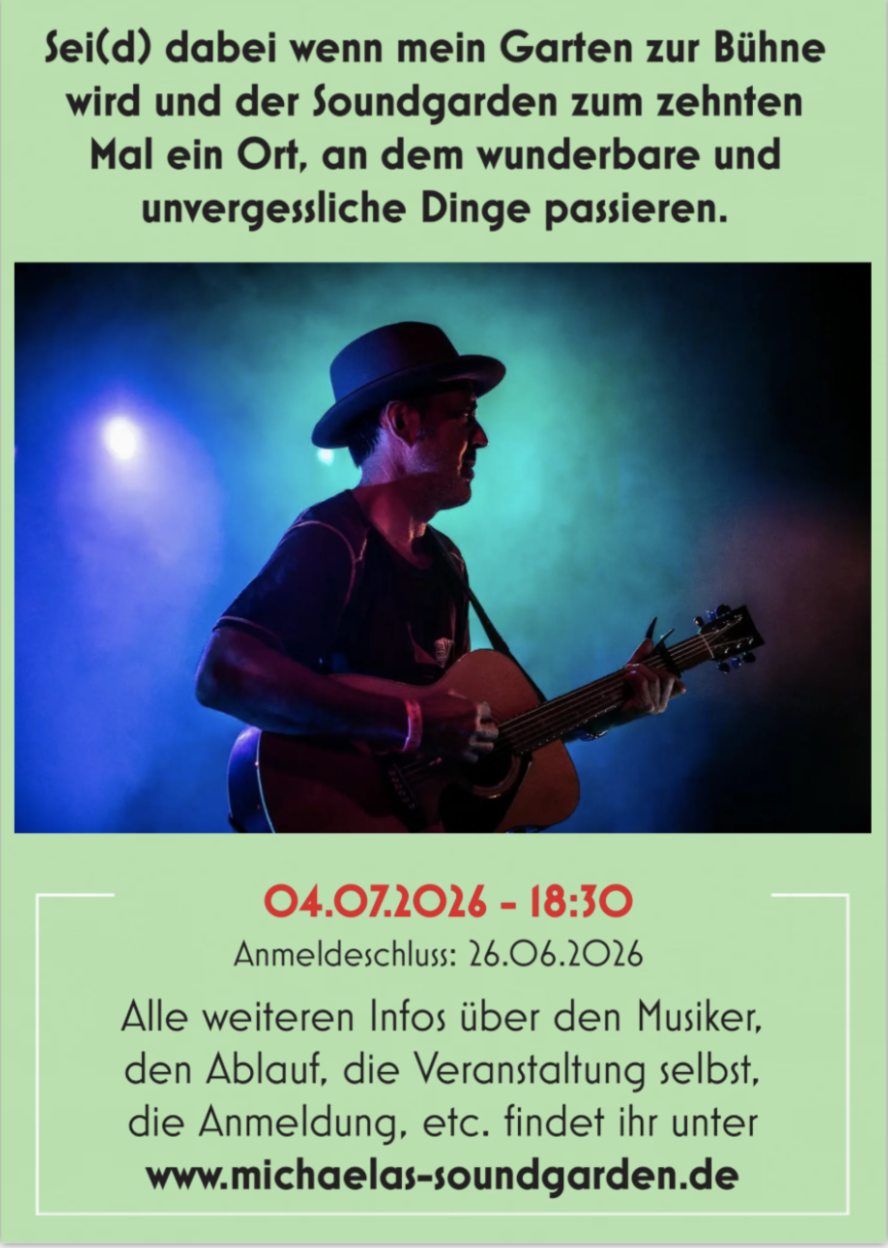 ANMELDESCHLUSS IST DER 26.06.26. ICH BITTTE EUCH ALSO ZEITNAH BEI MIR ZU MELDEN WENN IHR DABEI SEIN WOLLT! BEI ZU WENIGEN ANMELDUNGEN KANN DER SOUNDGARDEN NICHT STATTFINDEN.